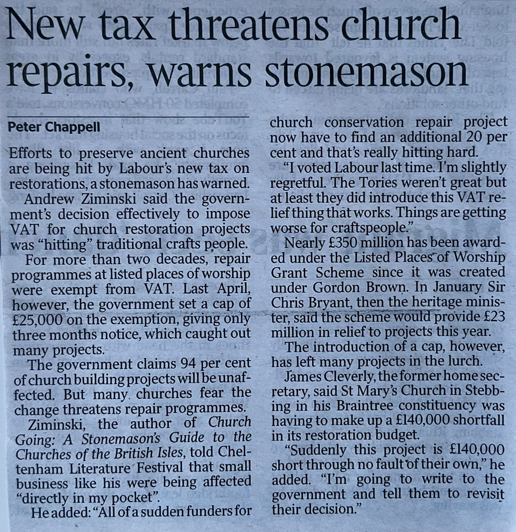 As part of the SGG building surveys of towns and villages in Somerset, we also survey the many, wonderful and varied churches (over 200 surveyed to date). An article in the Times newspaper on Saturday 18th October by stonemason Andrew Ziminski comments on the “New tax threatens church repairs, warns stonemason” . This was reiterated by him at the Yeovil Literary Festival drawing attention to the threat to restoring the fabric of our churches.